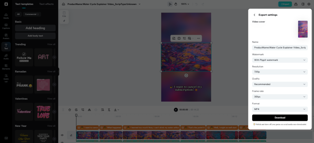 Once ready, click “Export” to save. You can “Publish” directly to social media or download your video with exact settings using the “Download” tab.